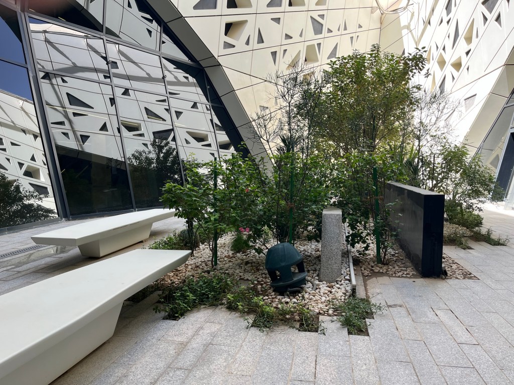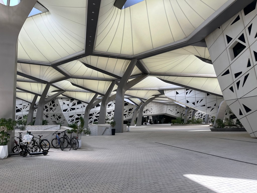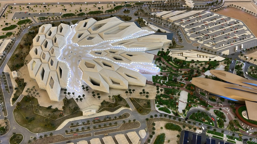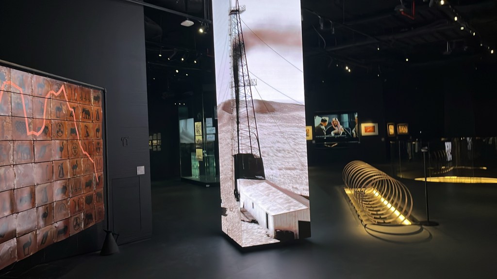 Installé dans une architecture spectaculaire signée Zaha Hadid, le musée s’inscrit dans un vaste complexe dédié aux questions énergétiques, à proximité du ministère de l’Énergie. Situé non loin de l’aéroport, il n’est ni central ni particulièrement ancré dans un tissu urbain vivant. Ce positionnement est révélateur : le musée semble s’adresser moins aux publics locaux ou scolaires qu’à un public international de passage.