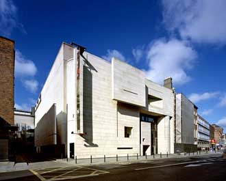 Il y a deux entrées, de part et d’autre du bâtiment. L’entrée historique, qui fait face au sud de la ville, est un bâtiment du XIXe siècle, un peu gris, peu engageant. Mais de l’autre côté, face au nord, se trouve l’entrée récemment construite, dans les années 2000. Très élégante, la façade est un peu rétrograde. « Moderniste », si vous préférez, au sens où le modernisme se repère facilement comme l’esthétique d’avant-garde de la Belle époque et des années vingt. Les Dublinois ont donc opté, au début du XXIe siècle, pour un agrandissement de leur musée qui rappelle le début du siècle précédent. La façade, en tout cas, est très « moderniste », disposant d’ouvertures variées et de grands pans cubiques, comme une toile de Mondrian. L’intérieur est aussi très élégant.