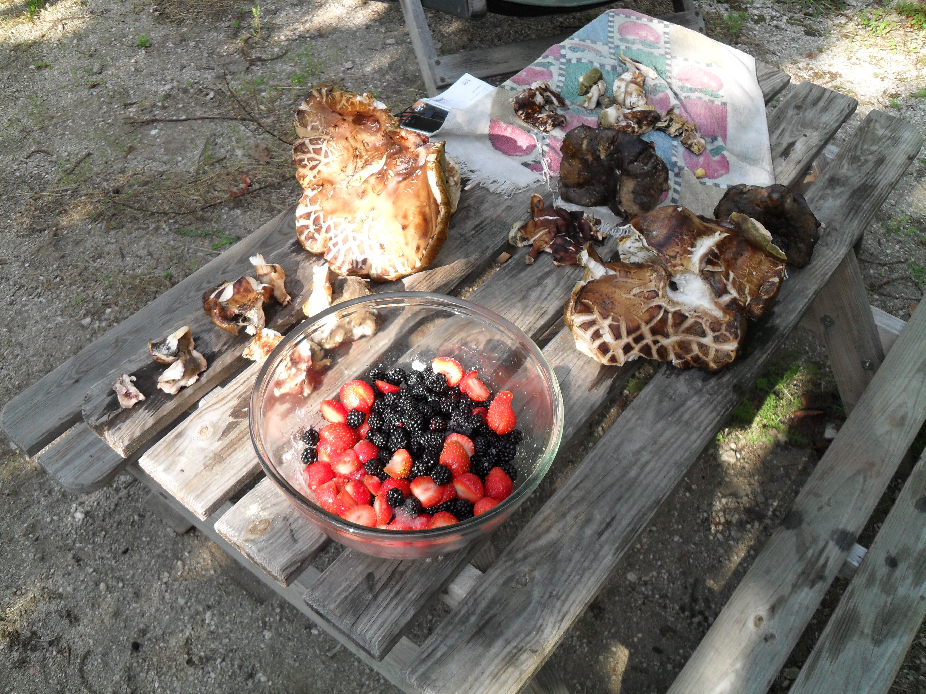 J’ai beau être réveillé de 4h00, je prends mon temps et ne pars qu’à 11h00. En montant sur les terrasses du terrain, je tombe sur un énorme cèpe, puis sur un autre. Très vite, dans le même périmètre, je vois cinq ou six champignons délicieux. Deux d’entre eux sont un peu violacés, et bleutés. On m’avait prévenu de la couleur de certains cèpes. Je les renifle pour m’assurer qu’ils possèdent cette odeur de truffe qui m’enchante. Ils l’ont tous bel et bien. Plutôt que de les mettre dans mon sac, je les descends à la cabane, sur la petite table en bois, où ils pourront sécher tranquillement.