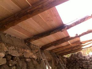 Un autre grand jour, où nous sommes fiers de nous. Sous mon insistance fébrile, car je trépigne à l’idée de voir un toit au mazet, nous sommes allés acheter de la volige à l’Union Forestière du Vigan. La volige, ce sont les planches de bois que l’on place sur les poutres avant de poser les tuiles.
