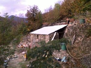 En quatre heures, le toit était entièrement recouvert de volige, elle-même recouverte de longueurs de plastique. Il ne manque plus que les tuiles, et l’on pourra dire que le mazet est habitable.