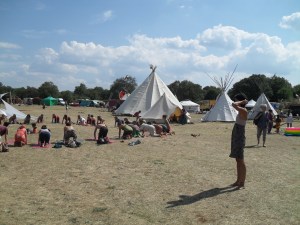 J’en aborde une autre, superbe et curieuse de mon attirail. En fait c’est elle qui me demande ce que je fais là. Elle refuse de se faire interviewer car elle n’est pas certaine d’adhérer pleinement aux tenants et aboutissants du festival. Elle est étonnée de m’entendre répondre que c’est justement une parole comme la sienne, fragile et incertaine, qui serait intéressante, à côté de celle des organisateurs qui savent manier l’argumentaire commercial. Elle ne cède pas, et je n’insiste pas. Elle dit venir d’Avignon et ne pas savoir combien de temps elle restera. Nous nous présentons l’un à l’autre et nous serrons la main. Je la verrai cinq minutes plus tard en train de méditer en tailleur, au son des cymbales d’un groupe qui m’apparaissait comme amérindien.
