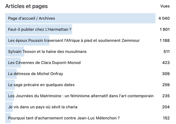 Puis viennent les billets les plus lus : gros succès pour L’Harmattan, à ma grande surprise. On comprend aisément la raison de ce succès. Chaque année, des milliers d’auteurs cherchent vainement à publier un manuscrit et j’ai offert dans ce billet un témoignage précieux pour ces auteurs en quête d’éditeurs.