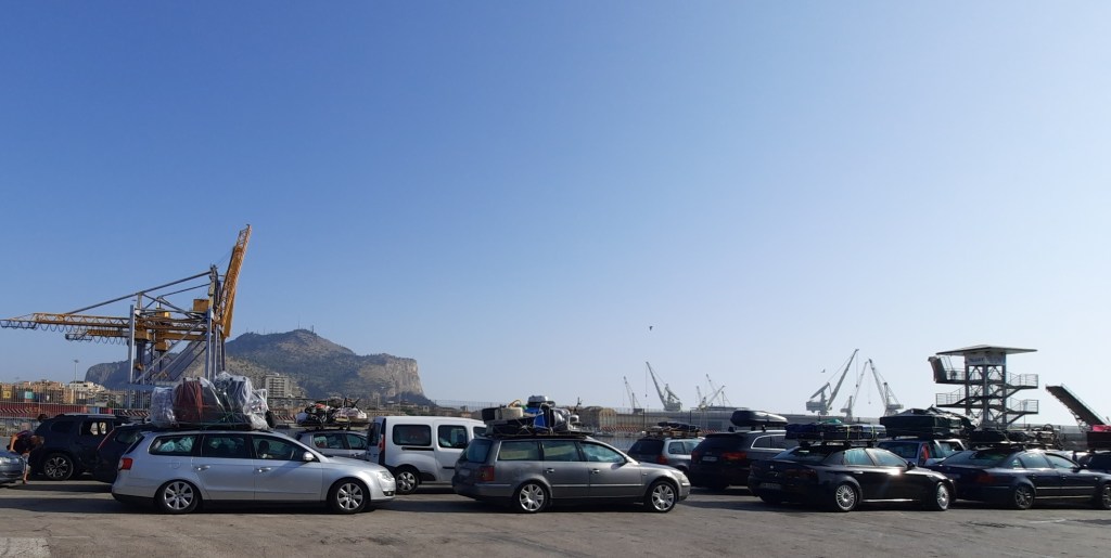 Embarquement à Palerme pour la Tunisie. Notre véhicule utilitaire est bourré de valises, de vaisselles, de matelas, d’alimentation, de matériel électronique et de livres.