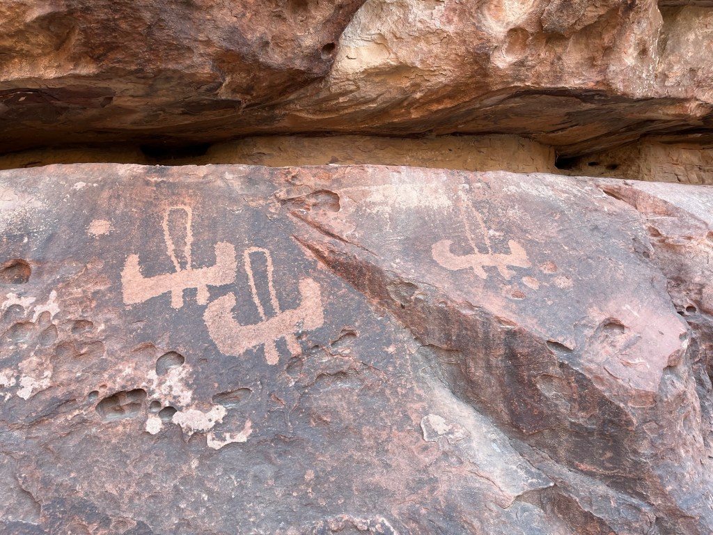Non, Abu Mahdi a un plan et une mission, mais je le découvre après coup : il veut me montrer les trésors rupestres qui jonchent la paroi. Je vois des gravures de loin et je confesse que cela me rassérène. Je me dis tant pis pour les crampes et les risques de chute ; si un vieillard pieds nus en robe et à la barbe blanche est capable d’escalader aussi facilement, le sage précaire pourra le faire au prix d’égratignures. Et même au prix de la vie, s’il le faut, car je ne vais pas faire machine arrière au moment où je m’apprête à voir des œuvres gravées il y a des millénaires et qui n’ont jamais été étudiées.