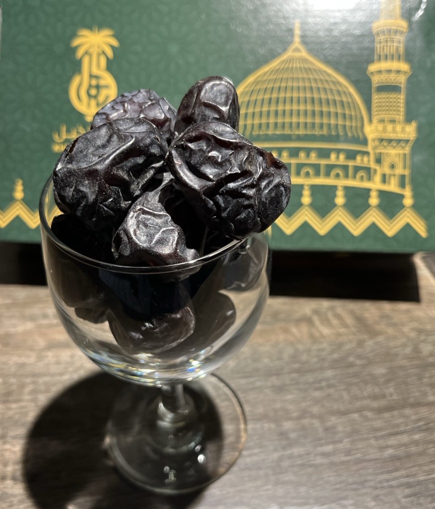 Nous avons donc reçu comme cadeau de Noël une boîte de dattes dites Ajwa Royal. Cultivées dans la ville sainte de Médine, les dattes Ajwa sont petites, presque noires, et tellement concentrées qu’elles ont un goût de réglisse chocolaté.