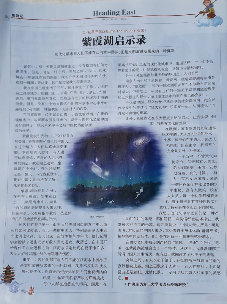 Nous étions quelques-uns uns sans famille, à Nankin, alors nous allâmes, Français, Belges et Chinois, à la Montagne Pourpre et Or pour manger et boire, et pour regarder la lune. Au sommet, nous escaladâmes des rochers et nous contemplâmes. Luluc et Mimic chantèrent La fameuse chanson : Yue Liang dai biao wo de xin. Elle dit à peu près cela : “Tu veux savoir combien je t’aime et la profondeur de mon amour ? Regarde la lune, elle représente à mon cœur.” Chez nous, cela voudrait dire que mon cœur est plein de tristesse, de froideur ou de douceur maladive. Ici, je ne sais pas vraiment ce que cela veut dire.