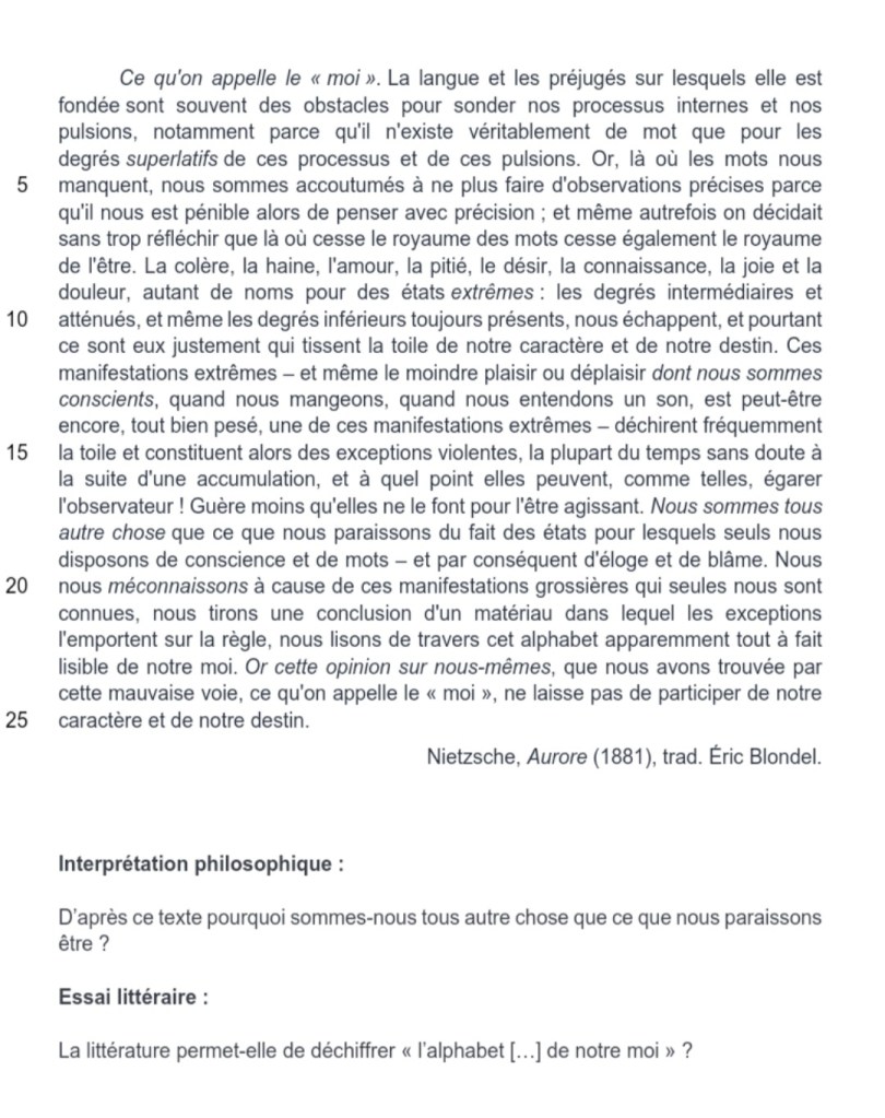 Les bacheliers devaient interpréter un texte de Nietzsche et rédiger un essai littéraire sur la question du moi. Mardi 21 mars 2023, le texte suivant tiré d’Aurore était proposé au jugement et à l’interprétation des élèves :