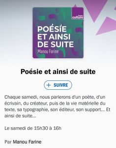 Cette émission de radio donne la parole à trois intervenants du monde de la poésie contemporaine, l’une est poétesse, l’un libraire et l’autre éditeur.